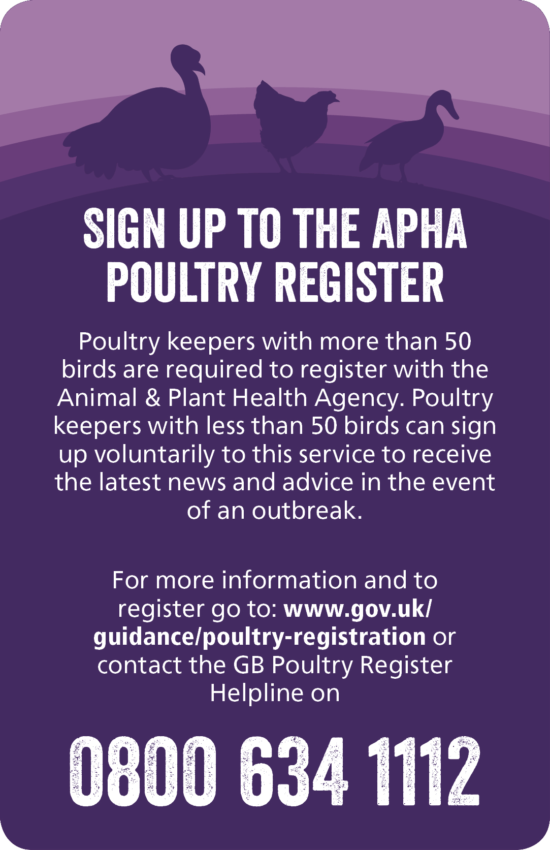 Working with highly pathogenic avian influenza virus Backyard Poultry Biosecurity Advice AI awareness poster BHWT Backyard AI poster Doorstep egg sales Flock Registration form Guidance for completing flock registration Infographic Biosecurity poster Poultry Register NFU AI credit card 1 NFU AI credit card 2